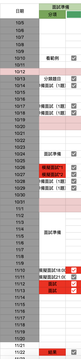 也就是說,想要等到結果公布再來準備面試,很有可能來不及,因為面試也是需要登入搶時間的。所以我在結果公佈前就開始準備面試,最後的Timeline實際上長這樣: